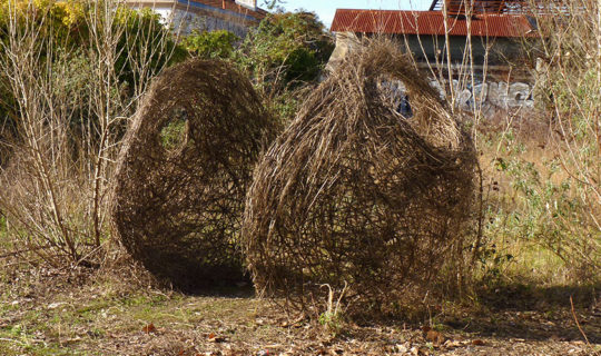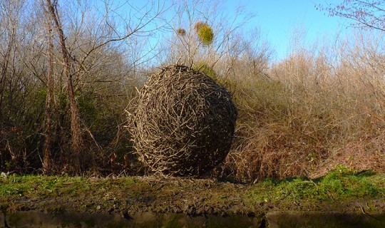 Au sein de chaque lieu où il est amené à travailler, il commence par s’imprégner de son environnement ; il l’explore, considère différents points de vue, devine les contours de ce qui pourrait s’y profiler, collecte les végétaux qu’il assemblera pour composer ses installations. Viennent ensuite les gestes, intuitifs et patients, et l’œuvre qui se dessine et que les promeneurs découvriront, au détour d’un bois, d’un parc ou d’une zone périurbaine.